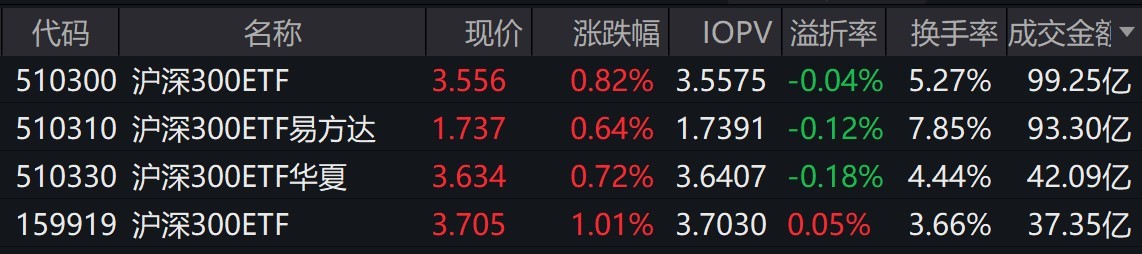 沪深300ETF今日大幅放量,4只规模靠前的沪深300ETF成交额合计超270亿元,华泰柏瑞沪深300ETF、易方达沪深300ETF、华夏沪深300ETF和嘉实沪深300ETF成交额分别为99.25亿元、93.30亿元、42.09亿元、37.35亿元。