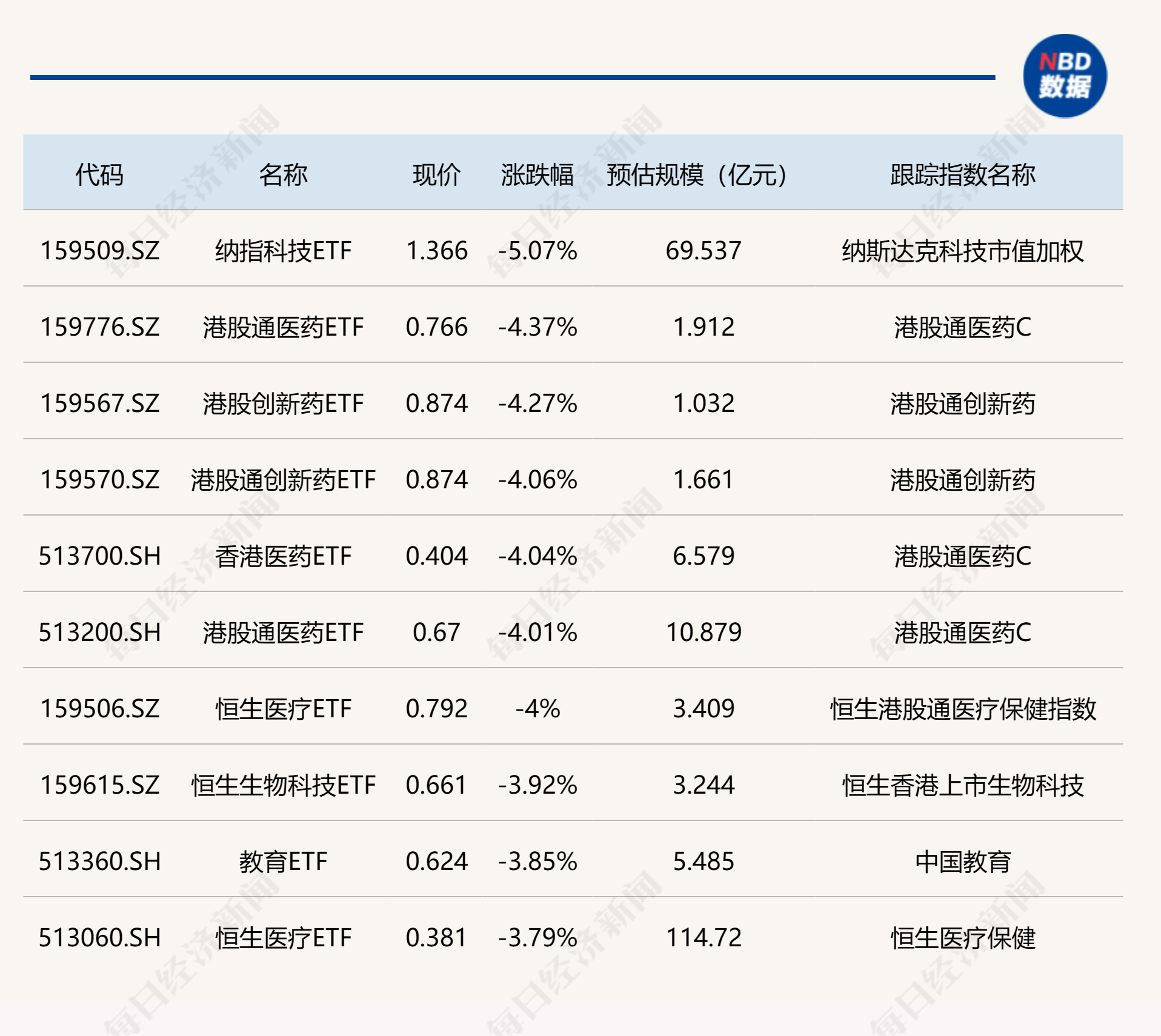 下跌方面,纳指科技ETF跌超5%,多只港股医药相关ETF跌超4%。